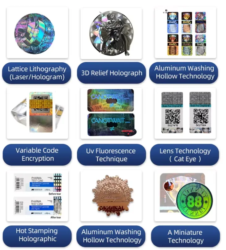 Etiqueta anti-conformastiene un efecto de imagen tridimensional único y alta seguridad. Este tipo de pegatina registra imágenes o información específicas en forma tridimensional en un medio especial a través del principio de interferencia láser, formando un patrón holográfico que es difícil de copiar.